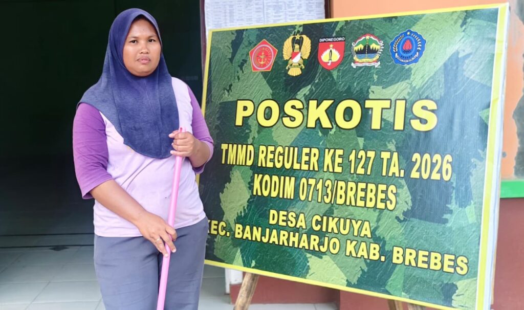 BREBES, BentangNews – Semangat kemanunggalan TNI dengan rakyat tidak hanya terlihat dari pembangunan fisik jalan atau jembatan, namun juga terpancar dari ketulusan hati warga Desa Cikuya. Hal ini dibuktikan oleh Ibu Antem (41), seorang pekerja kebersihan di Kantor Desa Cikuya yang secara sukarela turut merawat kebersihan Pos Komando Taktis (Poskotis) TMMD Reguler ke-127 Kodim 0713/Brebes.