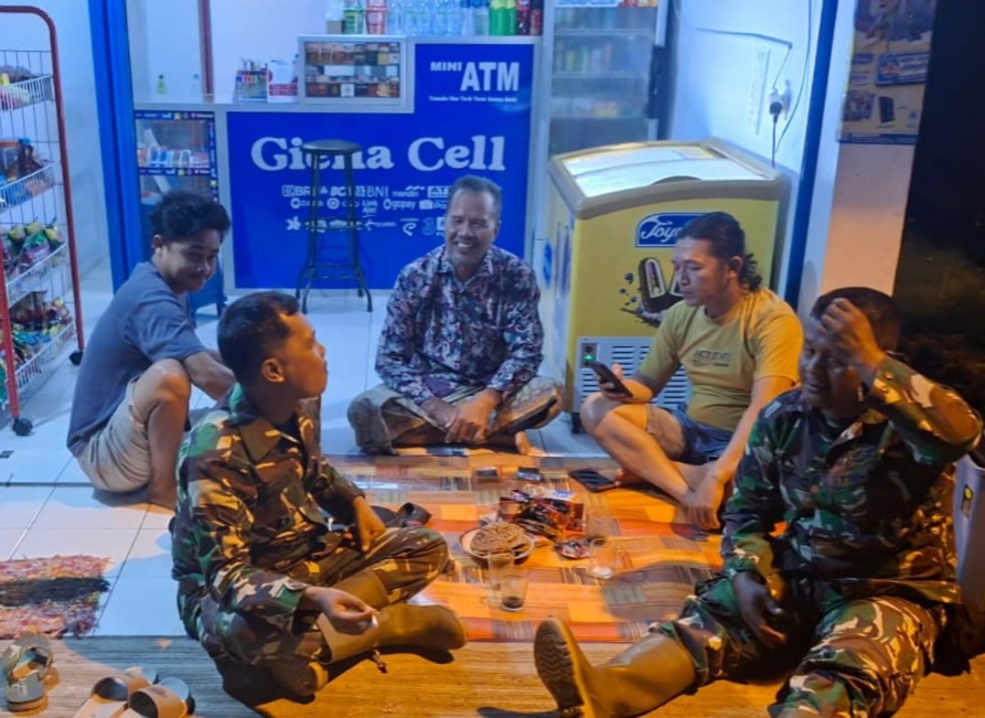 Terlihat dua anggota Koramil 14/Banjarharjo, Serma Suyitno dan Serda Suyatno, duduk lesehan bersama warga di depan sebuah kios “Giana Cell”. Tanpa sekat formalitas, obrolan mengalir hangat di atas tikar sederhana, menciptakan suasana akrab yang menjadi ciri khas kemanunggalan TNI dan rakyat.