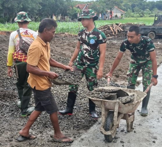 Sebagai bentuk rasa terima kasih, Pak Darwan tidak hanya berpangku tangan menonton para prajurit bekerja. Pria paruh baya ini terlihat antusias membaur, membantu mengaduk material hingga meratakan jalan di depan kediamannya.